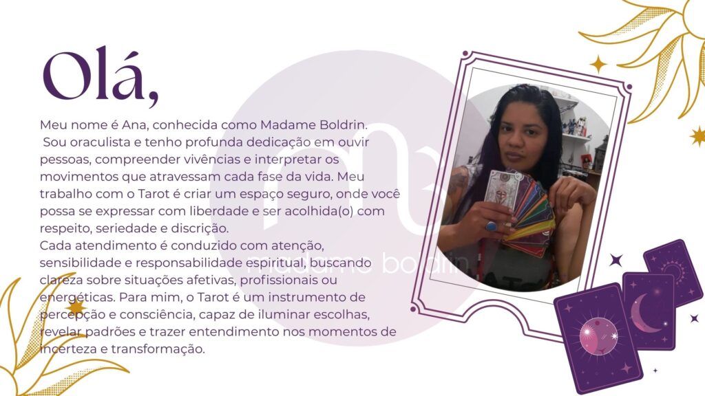 Através de uma leitura terapêutica ajudo identificar padrões de comportamento que podem estar limitando sua vida, orientando e indicando mudanças de padrões. Ela também pode ajudá-lo a descobrir novas oportunidades e caminhos que você pode não ter considerado anteriormente.